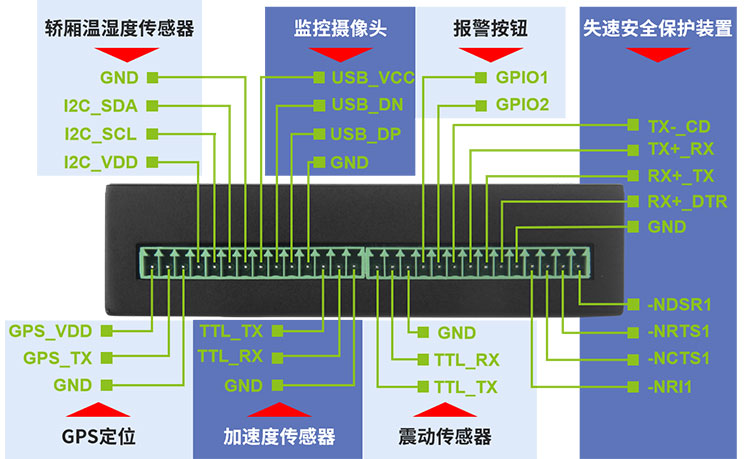 在整套电梯物联网管理方案中,将GPS定位传感器、轿厢温度传感器、加速度传感器、报警装置接入杰和R100;利用R100的边缘计算能力,对采集到的数据进行运算和整形,迅速识别并响应异常运行状态;最终通过无限局域网络或蜂窝数据网络上发至管理平台,完成电梯的物联网接入。