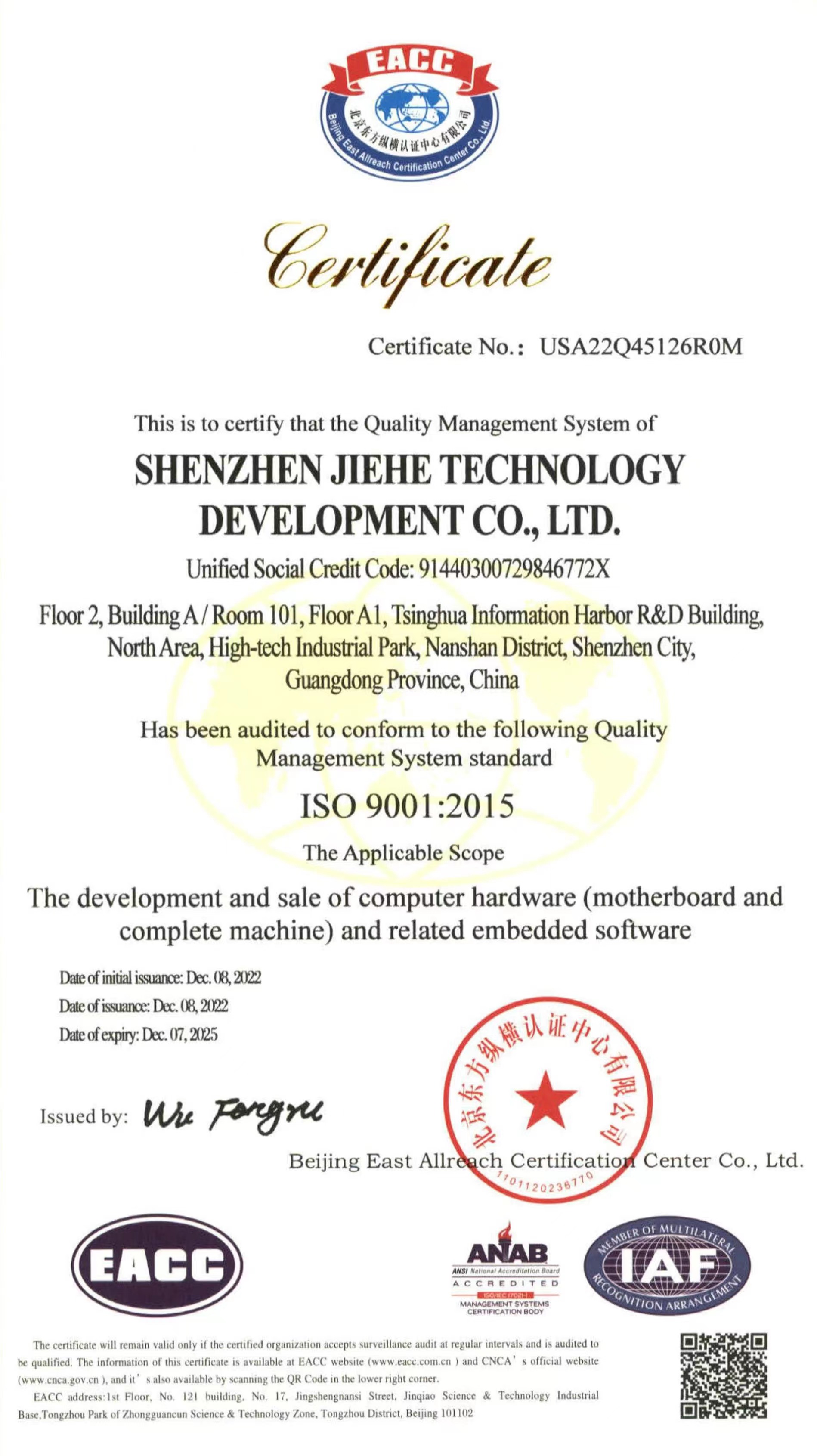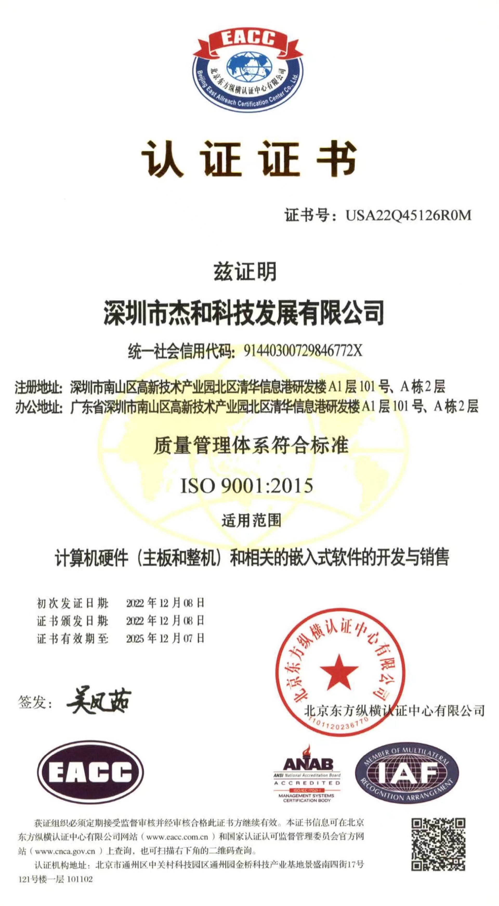 ISO9001质量管理体系认证作为国际标准化组织的管理性质标杆,它的地位可见一斑,其认可彰显了杰和科技的体系管理以及产品的质量。杰和科技在过去几年不断提升设备标准化生产的能力,减少人为质量问题,把ISO9001质量管理体系理念贯穿于产品研发—生产全流程。