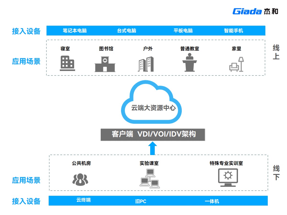 该大学最后选择了杰和科技云端虚拟实验室解决方案。该方案引入虚拟化技术,融合资源中心建设,将教学软件如用友、3DMAX、CAD等软件都在云端统一部署、更新。
