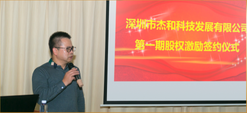 在签约仪式的开场致词中,杰和科技总经理林总首先对股权激励对象表示了特别的感谢,感谢他们对公司的信任与付出;期待大家一起共创,共担,共享,一起把杰和公司做强做大!去亲历,去见证杰和科技上市的那一天!!并且表示实行股权激励,对内激励员工,通过共同奋斗而享有公司发展的未来收益,对外吸引优秀人才加盟;针对上下游厂商,通过股权交换,购买的方式建立稳固的战略合作关系。