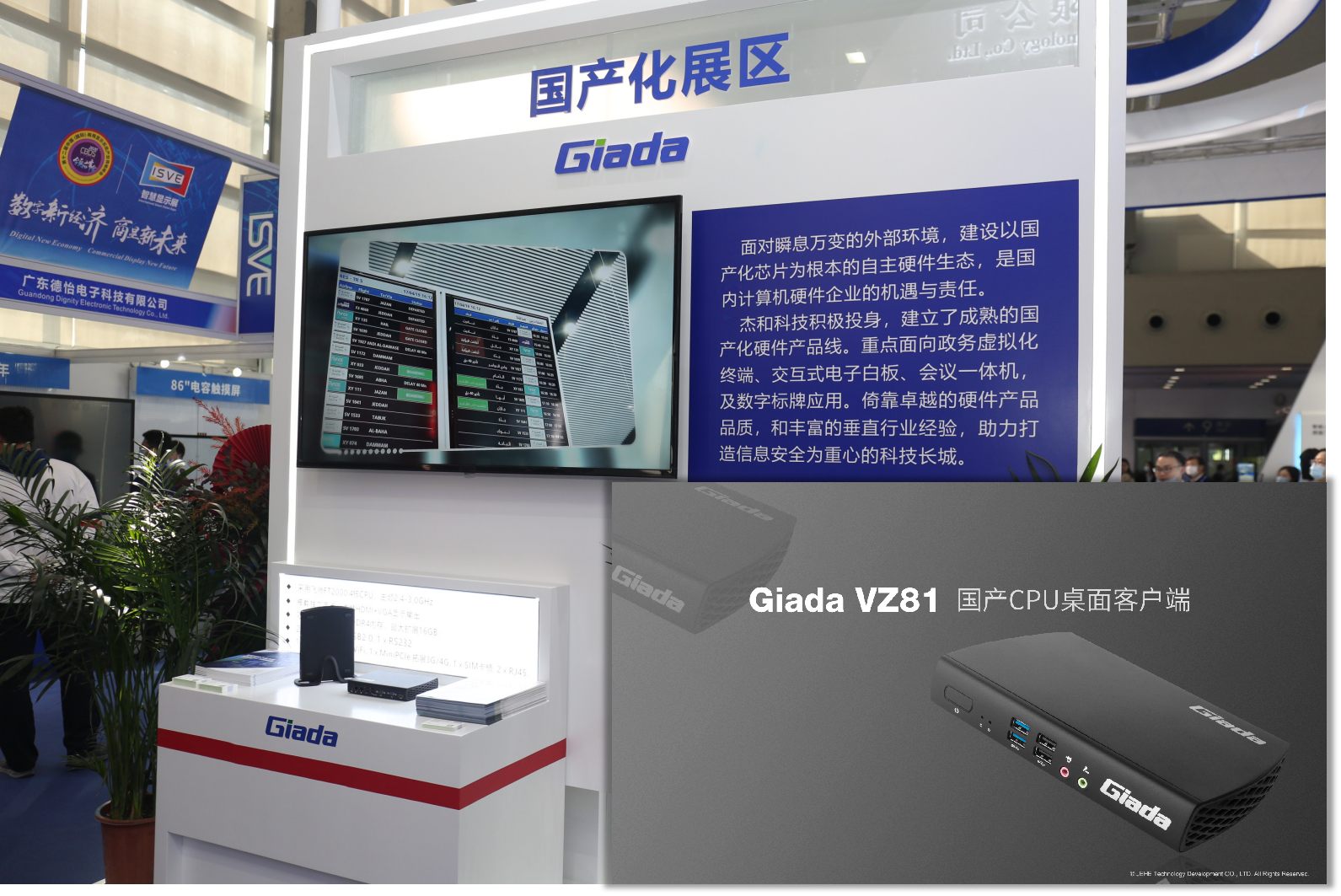展位的对侧是本届展会的另一大重点产品展区,聚焦国产化核心产品线。本次亮相的VZ81国产计算机经过了考究的工业外观设计,搭载16nm制程飞腾FT2000处理器,支持VGA、HDMI双视频接口拓展异显输出,双网卡双网口通讯。适用于政务、教育、公共服务及”8+2”应用场景。在国际形式紧张的大环境下,拥有自主独立的计算机硬件设计生产技术储备,是每个国内计算机硬件厂商的责任和担当。