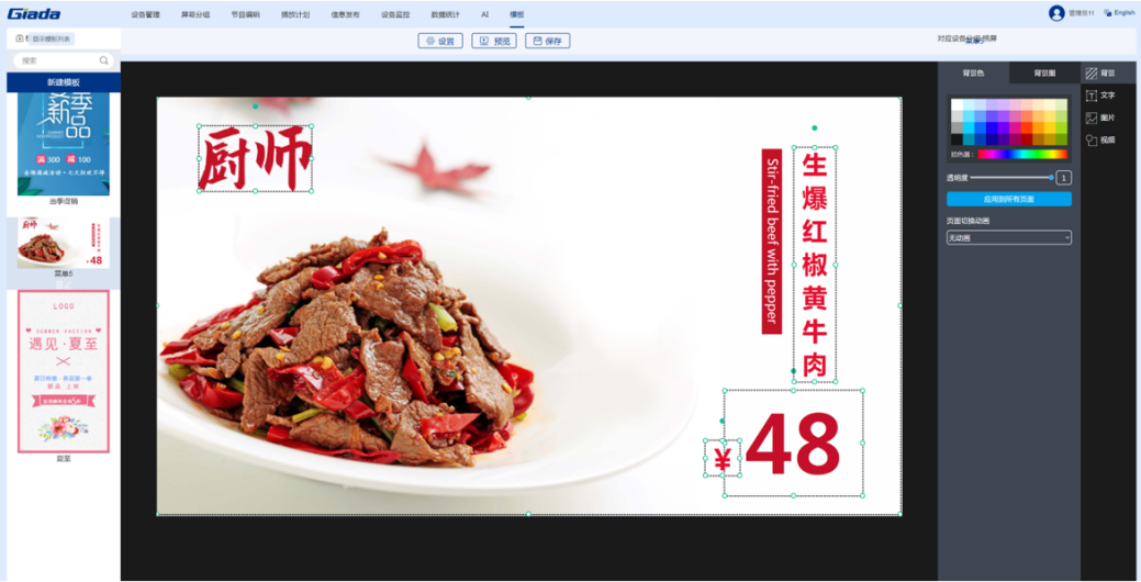 杰和科技智慧餐厅综合解决方案是由智能零售管理系统搭载公司自研的数字标牌播放器组成的软硬件一体化方案。该系统针对餐厅、酒店等不同行业提供典型节目模板,支持手机、电脑建议操作。用户只需3步即可完成节目的制作播放:选择节目模板,更换自己的素材(视频、图片和文字),预览保存及播放。价格、优惠折扣等信息可随时更改。