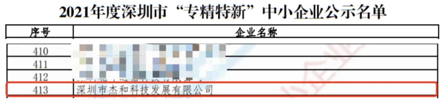 2022年6月15日,深圳市工业和信息化局公示了《2021年度深圳市“专精特新“中小企业名单》,深圳市杰和科技发展有限公司(以下简称“杰和科技”)凭借技术研发和产品创新方面的硬核实力,成功上榜!