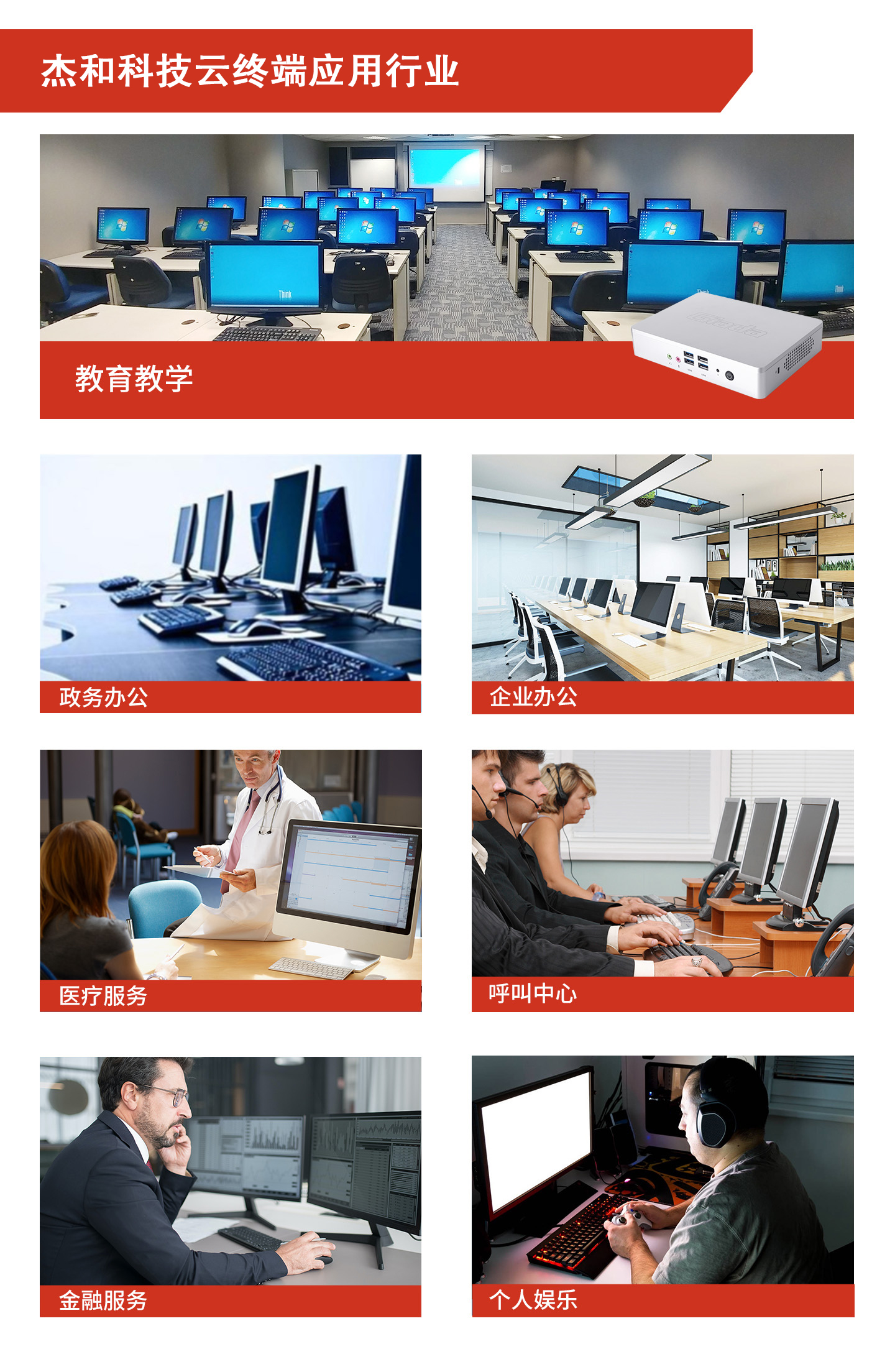 杰和科技一直致力于为所有合作伙伴提供更高效、更便捷、更安全可靠的数智化产品。我们也早在成立初期,就锁定云终端客户机市场,并持续进行优化,如今我们的产品已遍布各行各业!