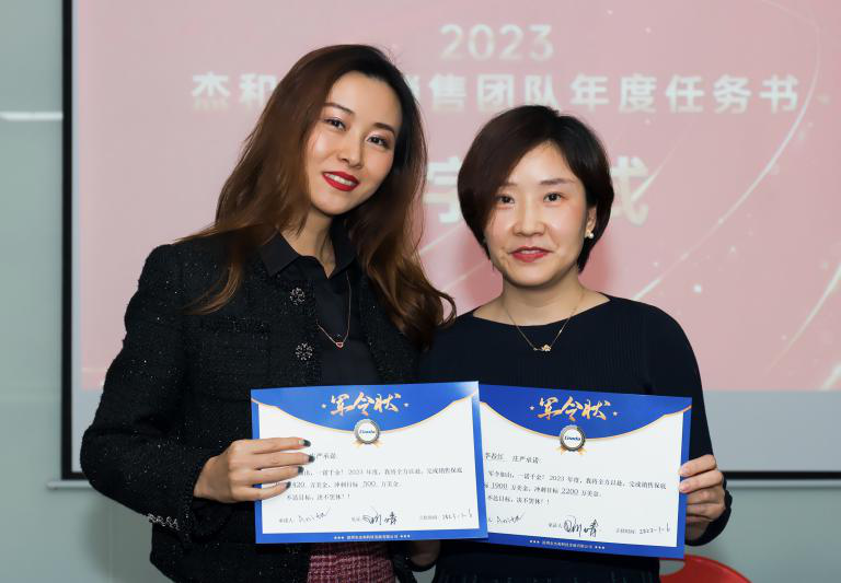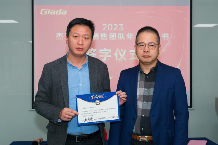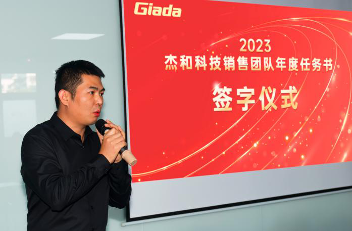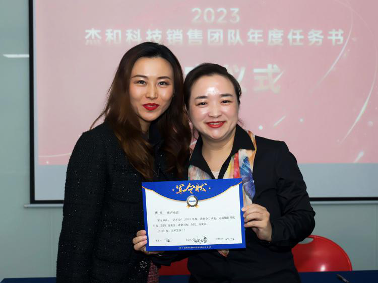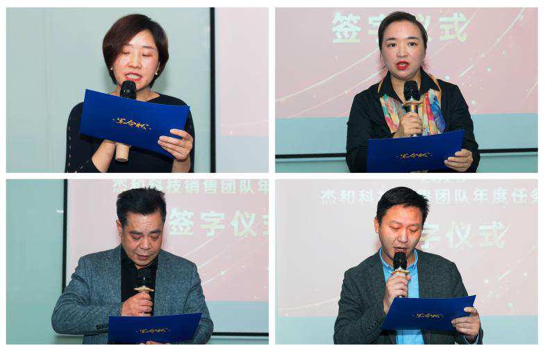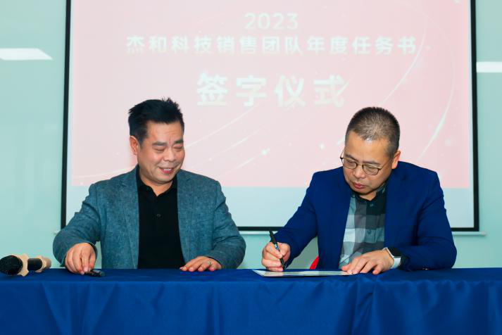 签约仪式上,一张张销售 “军令状”是确保完成2023年杰和销售战略的基石,同时是吹响再出发的冲锋号。各销售人员手捧责任状,虽知千斤担,但都敢于亮剑,勇攀高峰,责任状上一个个响亮的数字串就成杰和的星光大道 。
