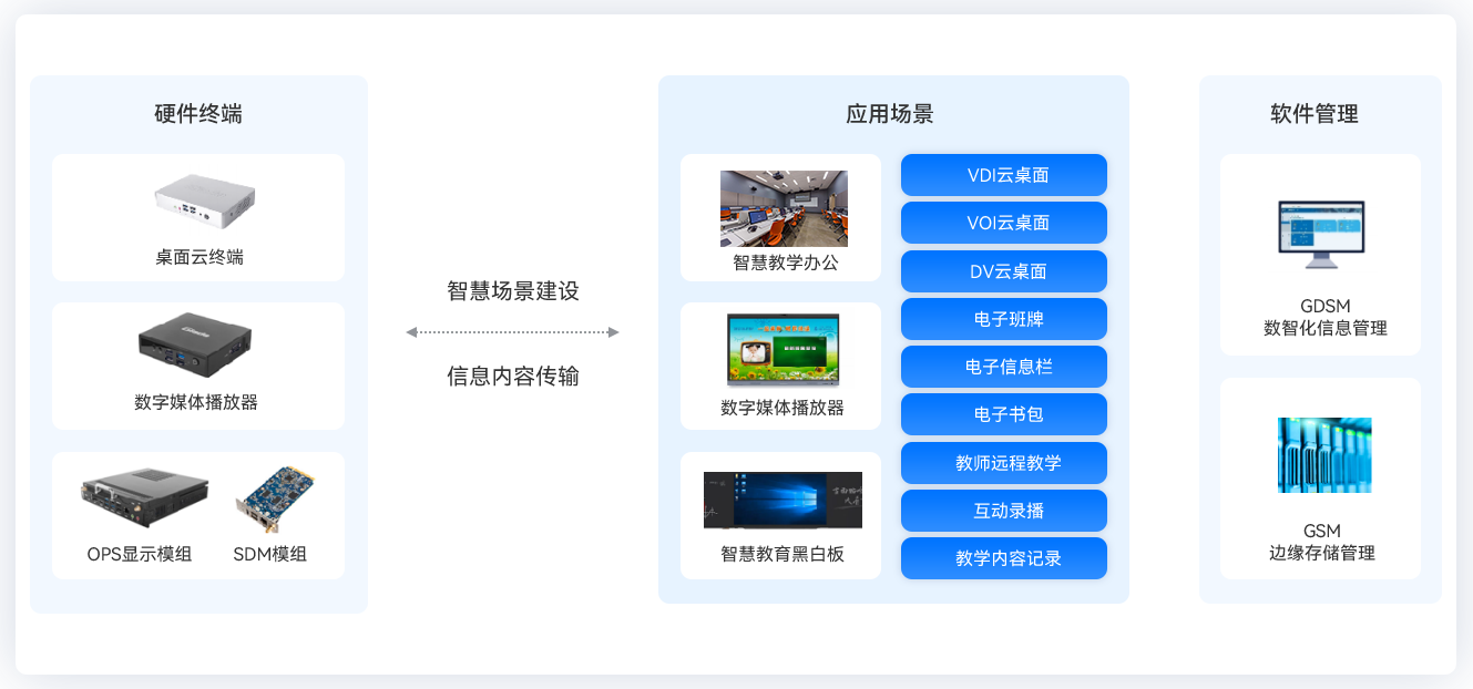 杰和智慧校园解决方案是基于智能硬软件打造数字化教学场景,实现智慧课堂、智慧黑白板教学,建设多媒体信息发布平台,优化校园管理模式,让前沿科技融入实际教学,实现教育体系各类软硬件和各个角色之间的紧密连结,提升教学质量,最终推进教育数字化转型。