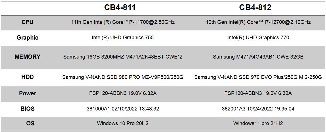 Giada杰和科技针对这款一体机专研主板CB4-8121进行了EVT全功能测试,针对客户会关注的各个重点进行了全面测试,包括各功能、性能、兼容性、稳定性等方面的专业测试及分析。CB4-8121不仅全部通过,且各个数据结果都表现相当出色,优秀的配置与研发设计工艺,无疑让用户的使用体验直线拉满。全性能测试报告中,值得关注的是性能测试的跑分数据和稳定性测试内容,这能直观影响主板在一体机中的稳定性和用户的使用体验。针对性能测试,我们选择了将CB4-8121与前一款更迭产品CB4-8111进行对比分析,并分别选取了以下配置:
