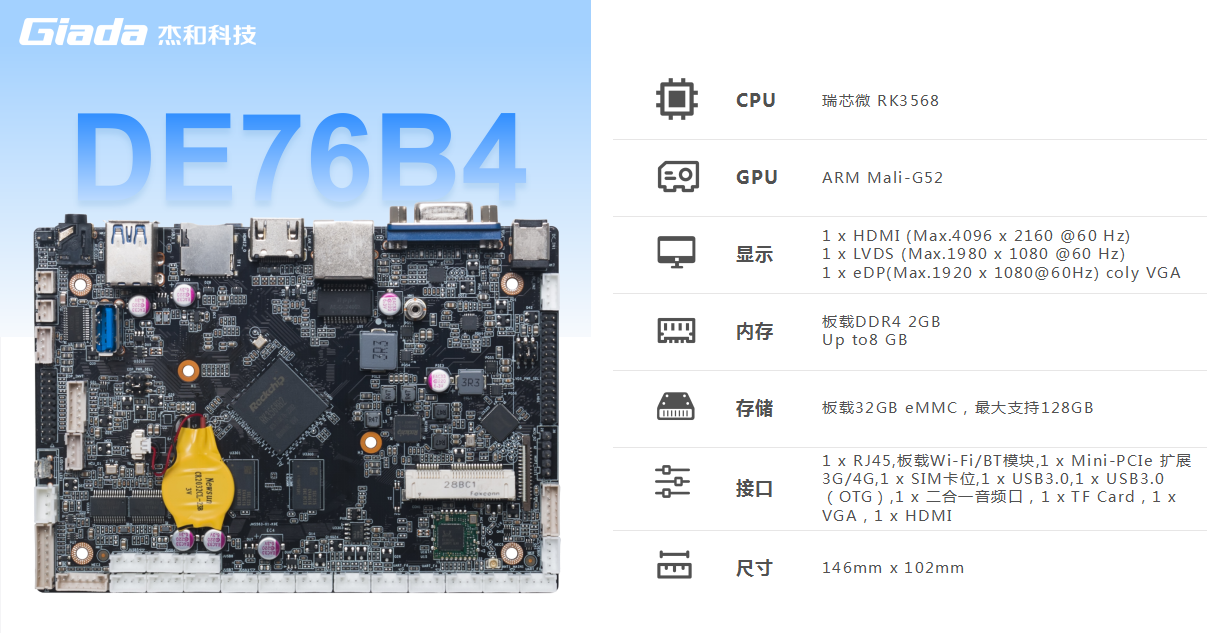 杰和科技DE76B4集成ARM Mali-G52 GPU,支持4K@60fps H.265/ H.264/ VP9/ VP8视频解码,支持多路视频源同时解码,具备强大的视频编解码能力;支持1 x HDMI支持4K视频输出,1 x LVDS,1 x VGA(coly eDP)多种显示接口,实现多屏异显,出色的图形处理能力,为用户提供更清晰、流畅的画面体验。