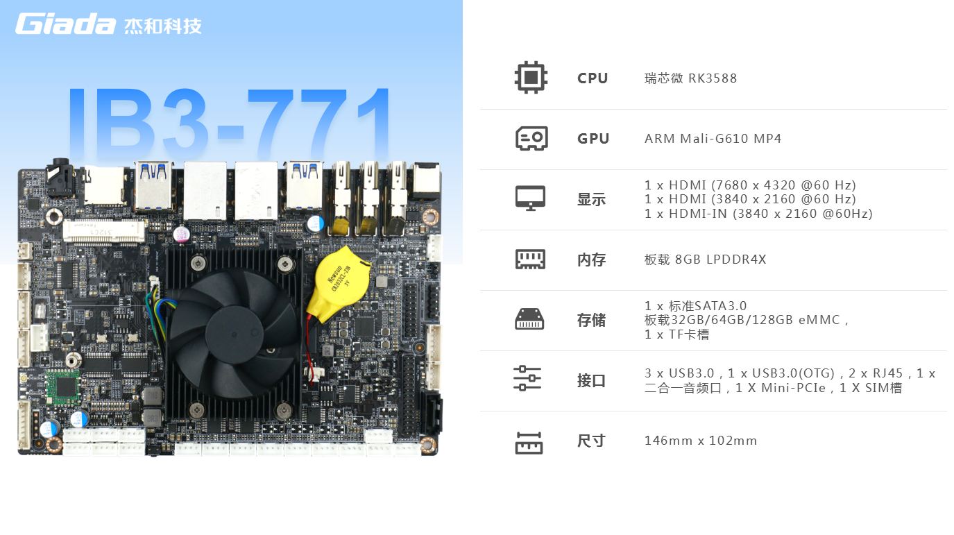 杰和科技IB3-771基于Rockchip瑞芯微RK3588处理器而开发,RK3588作为瑞芯微新一代旗舰级高端芯片,搭载四核A76+四核A55的八核CPU和ARMG610 MP4 GPU,内置6 TOPs算力的NPU,具有高算力、低功耗、超强多媒体、丰富数据接口等特点,CPU运算能力更强,图形处理能力方面表现出色。
