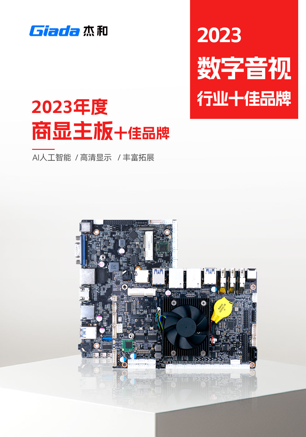 2023年接近尾声,新旧更替之际,第15届DAV数字音视工程网“数字音视行业十佳品牌评选活动”获奖名单新鲜出炉。杰和科技在此次评选活动中,荣获“2023年度商显主板十佳品牌”、“2023年度数字标牌播放器十佳品牌”两项大奖,Giada杰和科技已连续四年登上同一榜单。