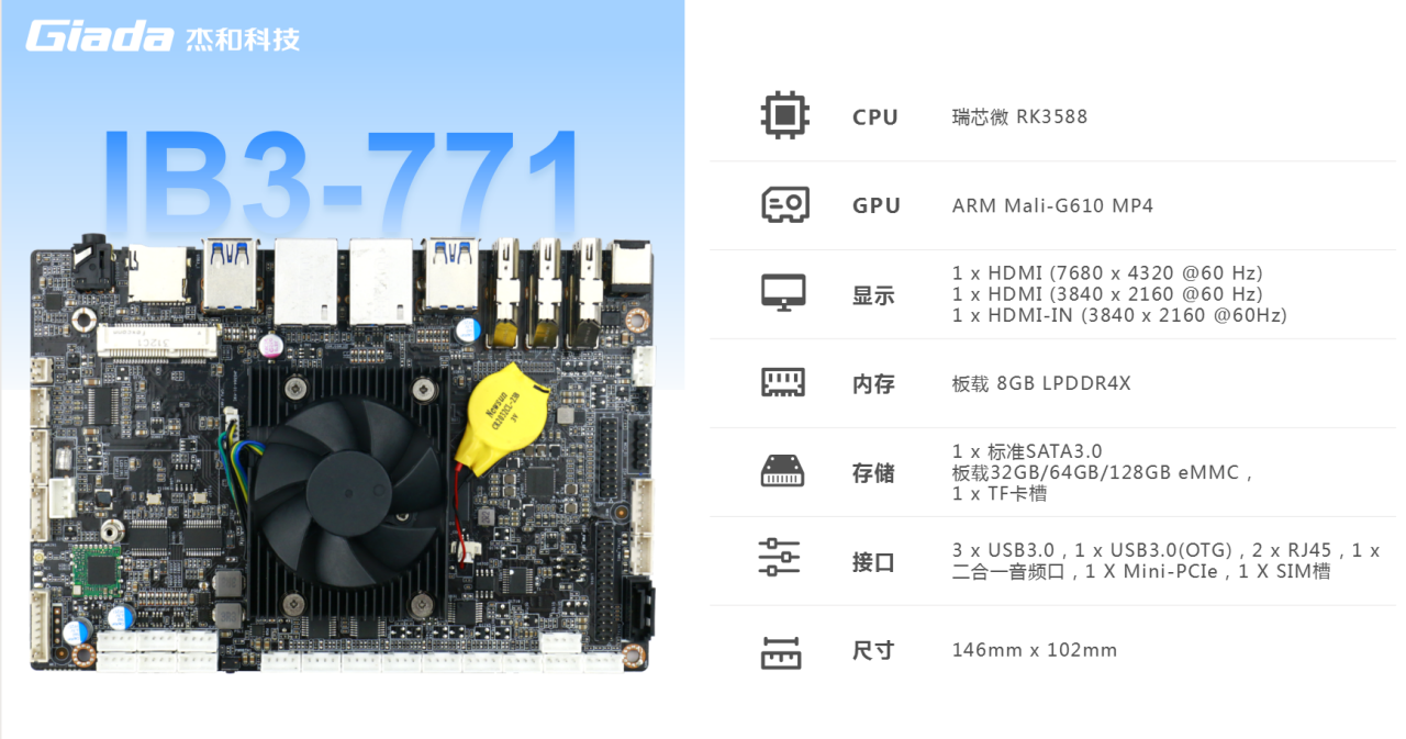 杰和主板IB3-771搭载瑞芯微RK3588八核64位处理器,内置6TOPS算力的NPU,具备高算力、内存大、超强多媒体、多重扩展等技术优势。满足8k超高清视频的显示需求,还支持主流深度学习框架,为各类 AIOT 应用场景提供更优的性能表现,支持机器人、边缘计算、智能NVR、智能汽车、智慧大屏、AR/VR、智能自助终端场景的广泛应用。