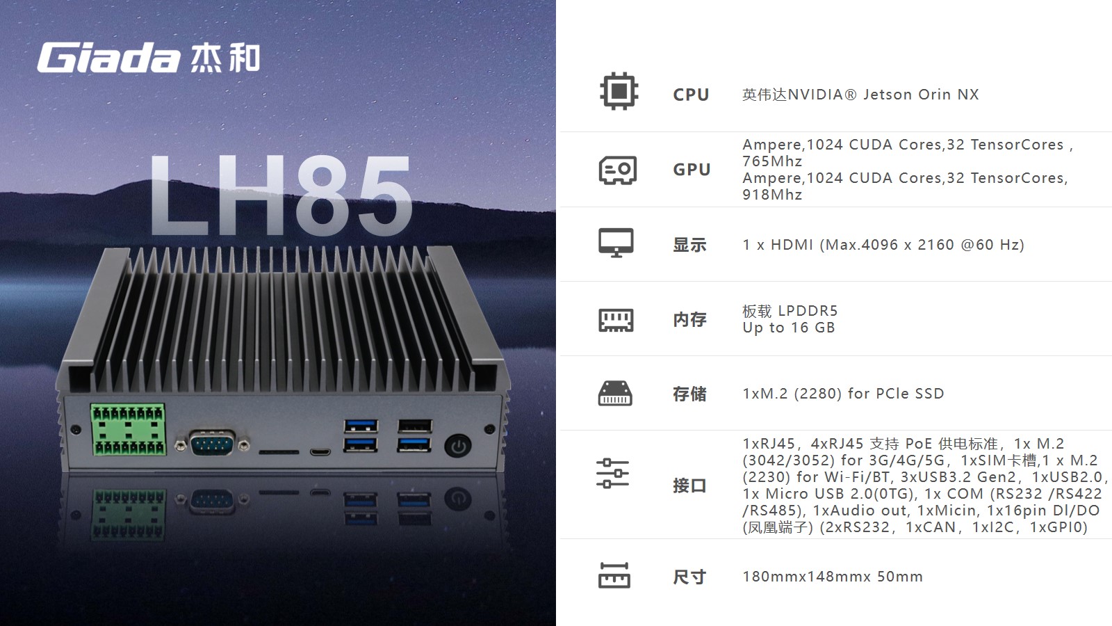 杰和科技AI边缘计算LH85,拥有100TOPS超强算力,能为工业控制领域客户的AI应用提供强大的算力支持和充足的通信、控制接口保障,可广泛应用于智能制造、机器视觉、AGV、智慧城市等领域。