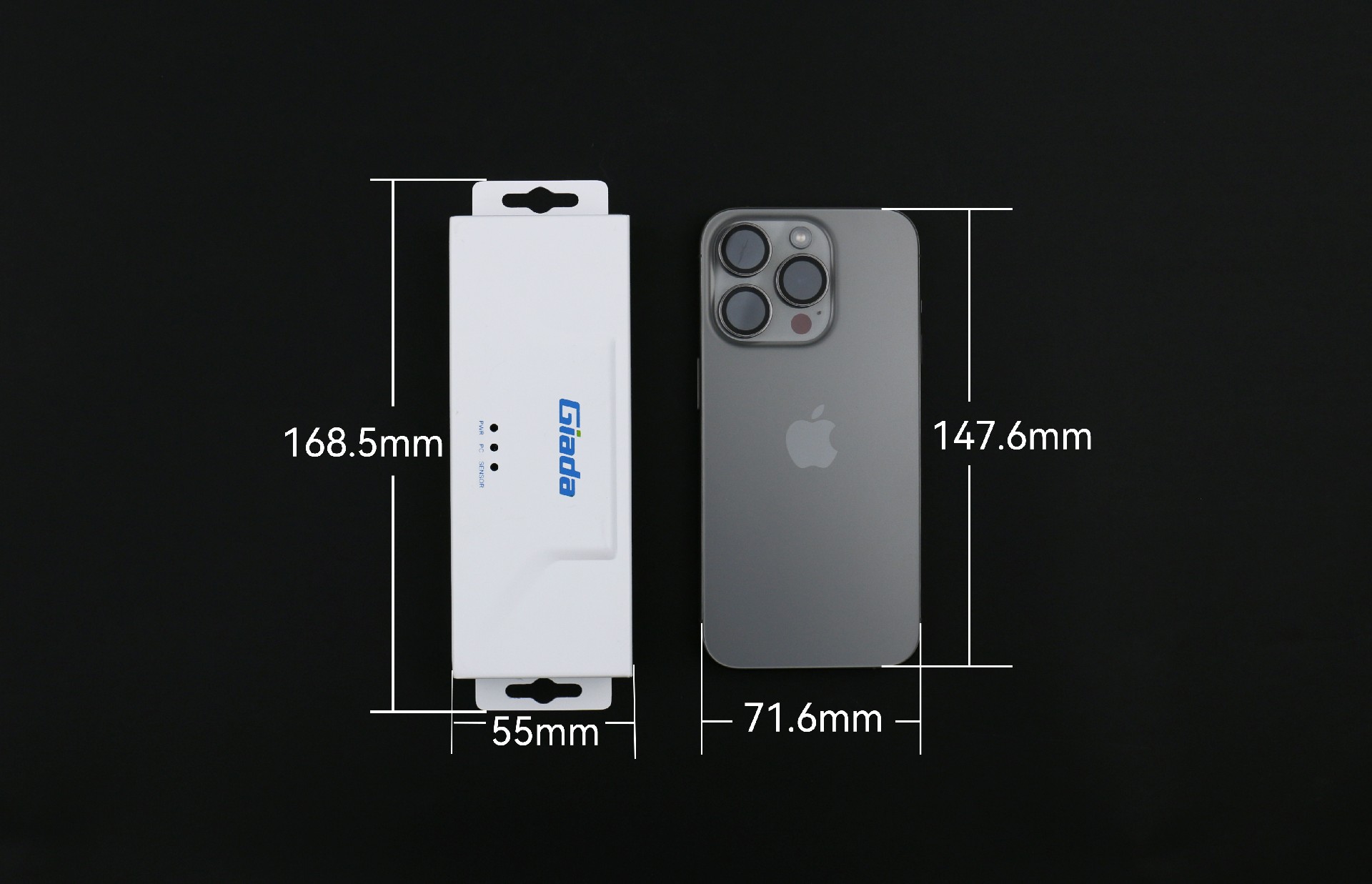 杰和物联网拓展坞RD01外部为白色,顶部印制杰和Giada的彩色logo,外壳采用金属材质,左右两侧设计同材质挂耳,可以方便用户固定设备。