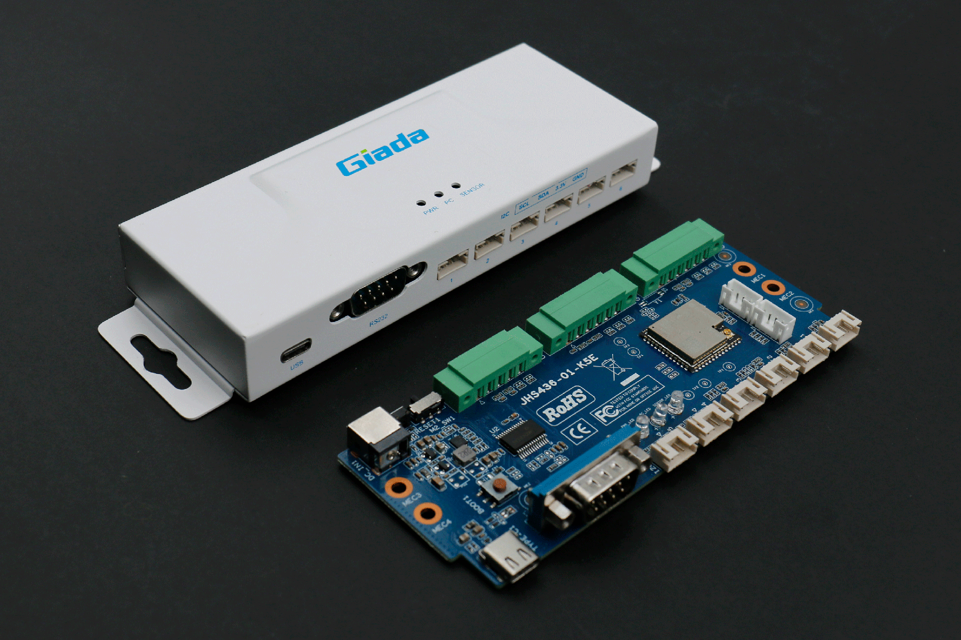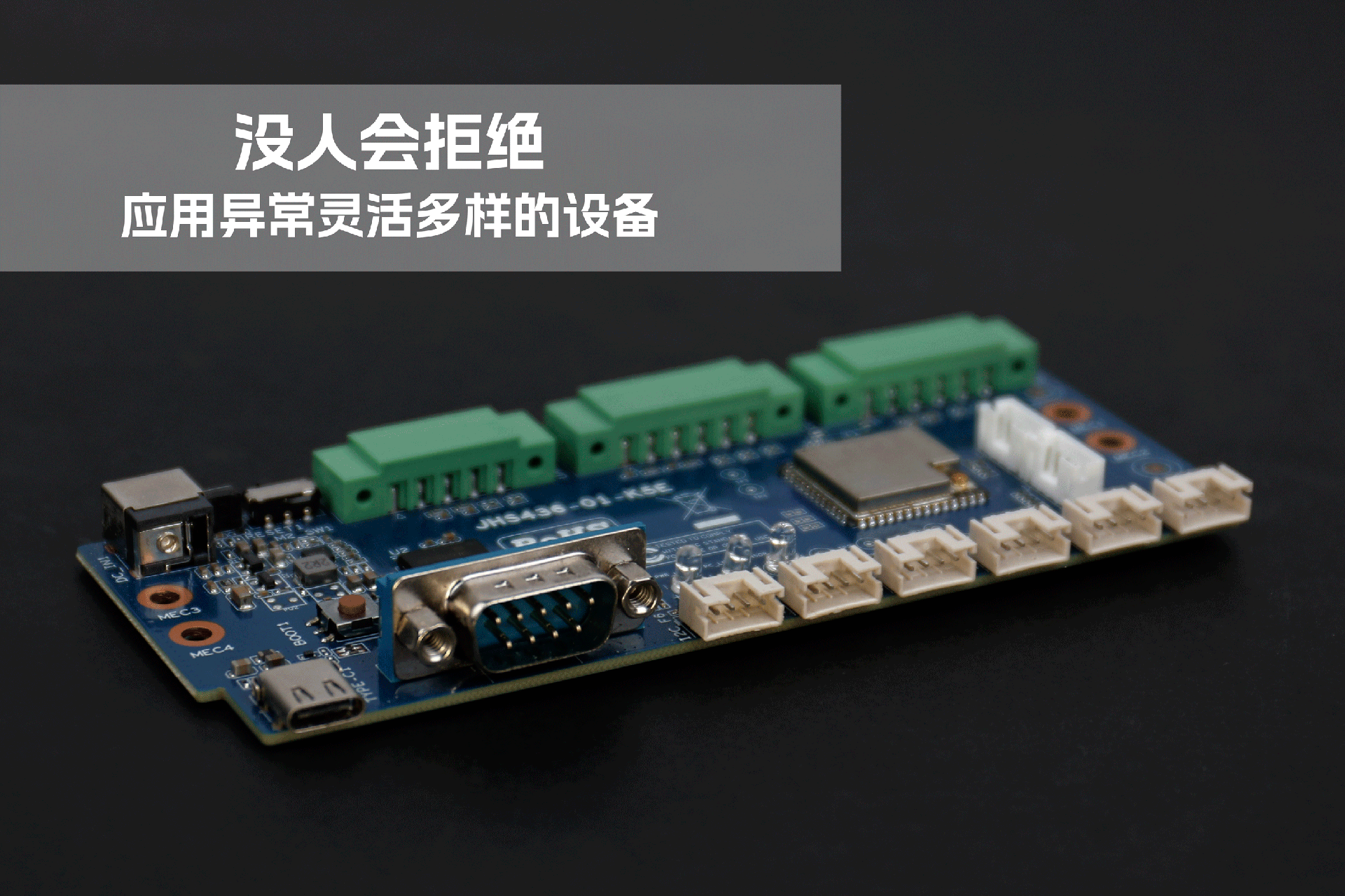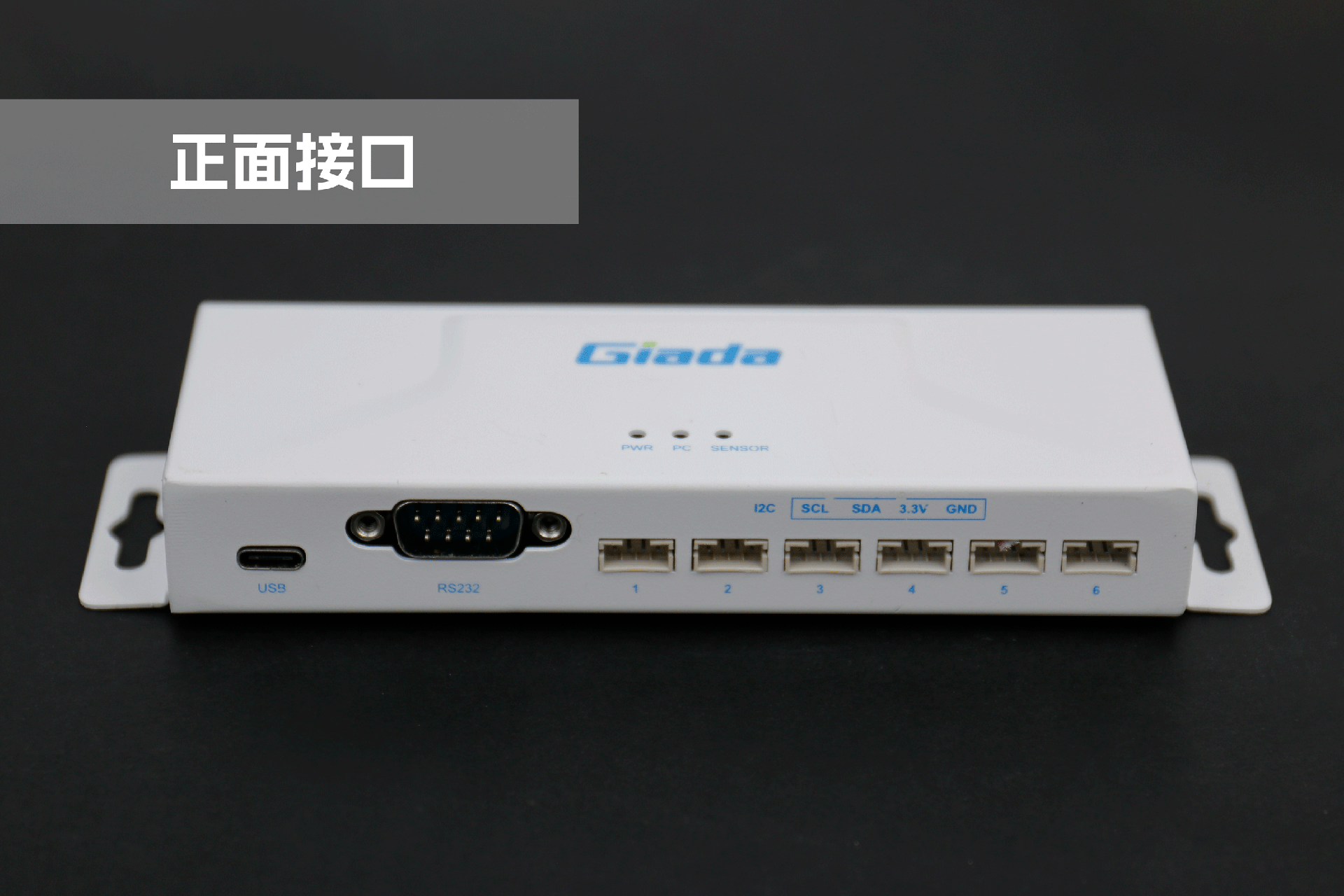 杰和RD01接口丰富,正面配备1个USB Type-C,用来与媒体播放器通信(USB串口)和供电;1个RS232 串口,采用 DB9 端子,支持 DTS 和 CTS 信号,可用来与媒体播放器通信;6个I2C接口,采用6组HY2.0-4PIN端子,用于与传感器通信。在顶部设置3个LED 灯,用于状态指示,LED1通电显示蓝色,LED2与媒体播放器通讯闪烁绿色,LED3与传感器通讯闪烁绿色。