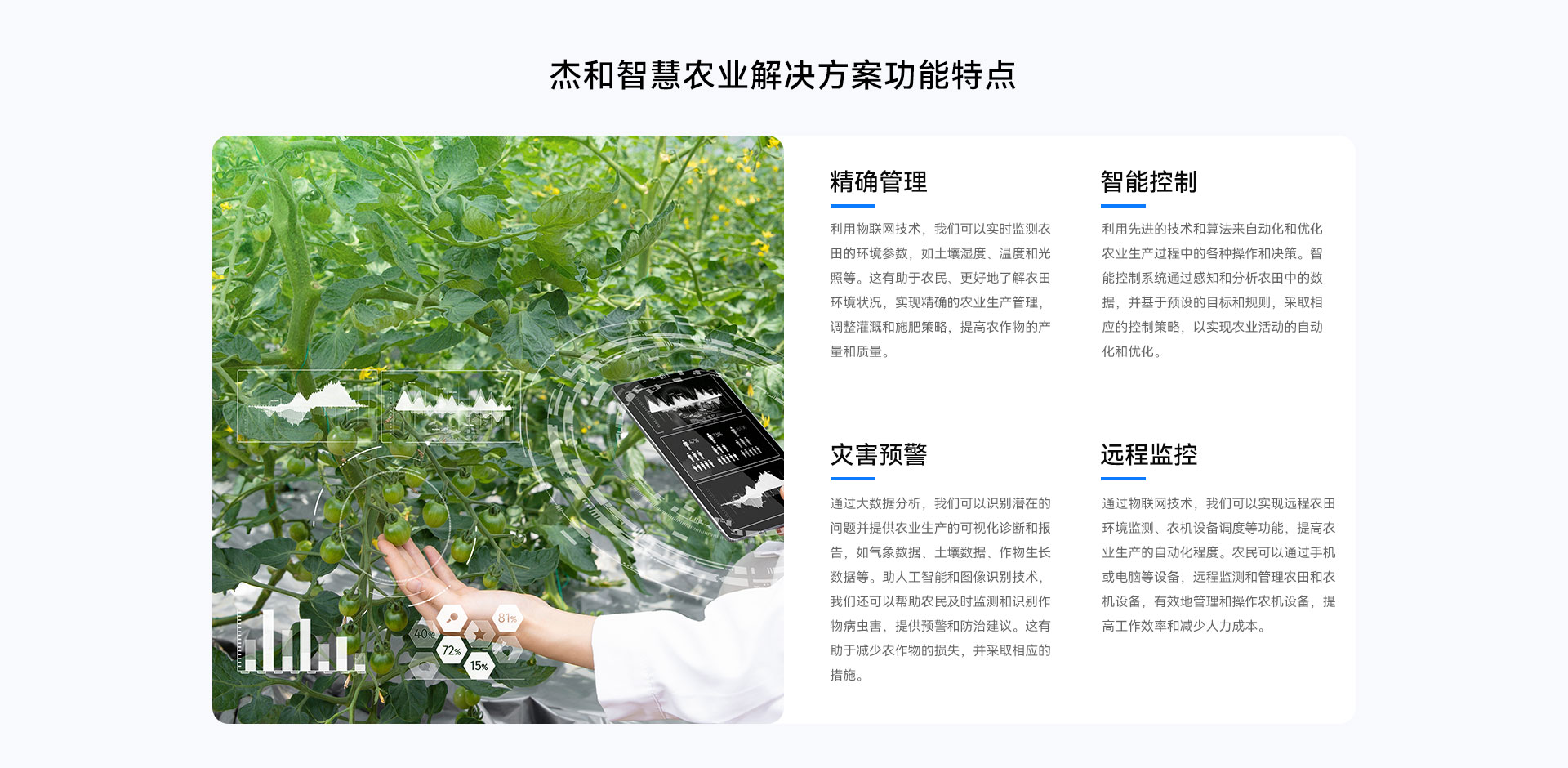 杰和智慧农业解决方案是一套基于物联网、云计算、大数据等技术的综合性